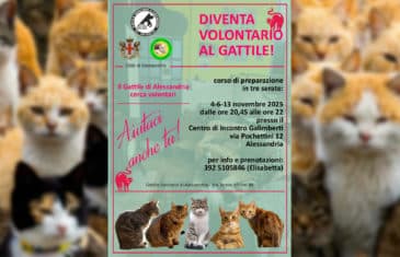 Il Comune di Alessandria, in collaborazione con l’Associazione A.T.A. – Associazione Tutela Animali, organizza un corso di formazione gratuito e con iscrizione obbligatoria per tutti coloro che desiderano diventare volontari del Gattile Comunale. Il corso, tenuto dalle volontarie del Gattile Comunale, con la collaborazione della Dott.ssa Delia Paiar, medico veterinario, e dell’Ing. Claudio Malaspina, presidente […]
