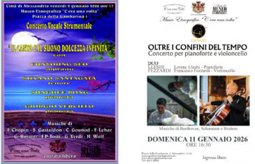 Leggi...Il Museo Etnografico di Alessandria “C’era una volta” [piazza della Gambarina 1], in collaborazione con il Comune di Alessandria e con il supporto degli ‘Amici del Museo Etnografico Gambarina’, presenta un ricco calendario di appuntamenti culturali per il mese di gennaio 2026, confermando il proprio ruolo di centro attivo di promozione culturale, musicale e storico-artistica. […]